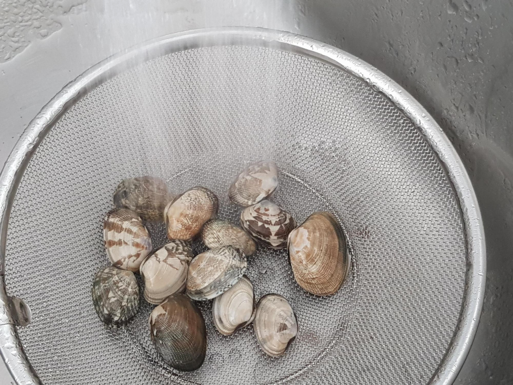 1. 먼저 바지락을 깨끗하게 박박 문지르면서 흐르는 물에 잘 닦아줍니다.