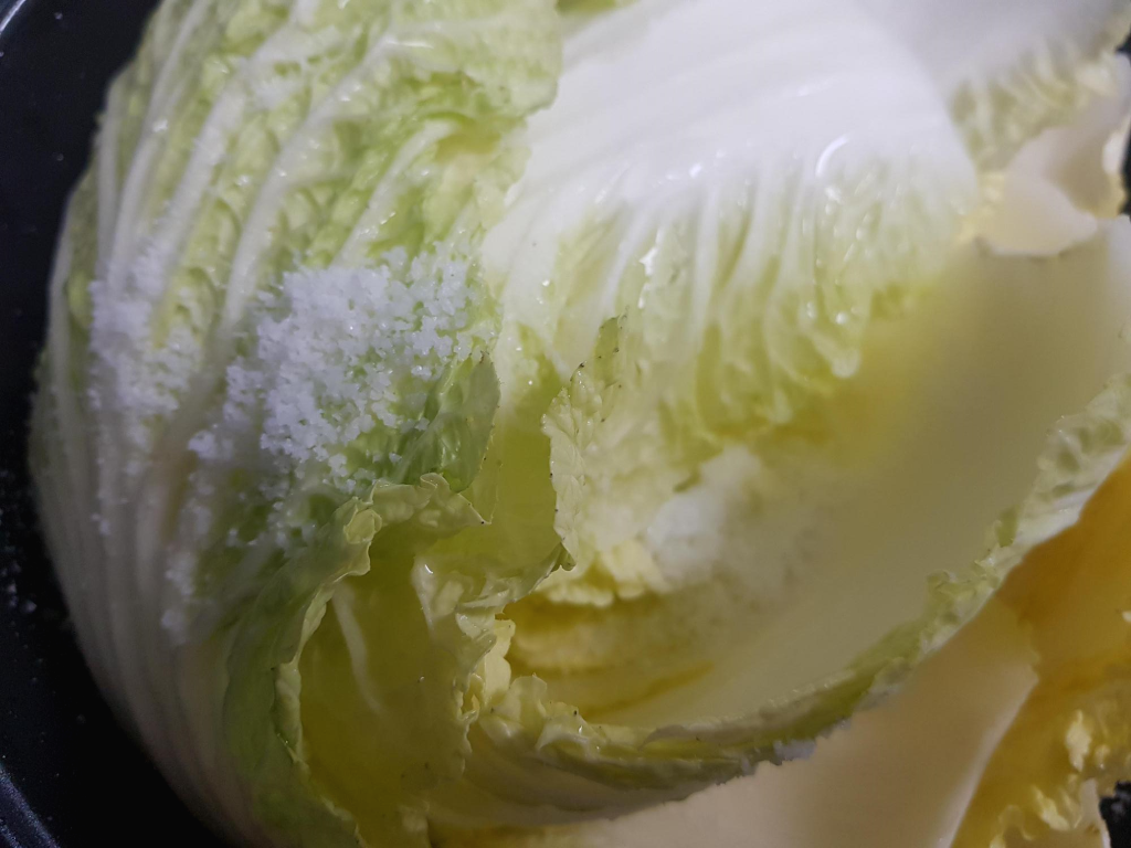 배춧잎은 흐르는 물에 깨끗하게 세척한 후 소금을 3 수저를 넣고 물에 끓여줍니다.