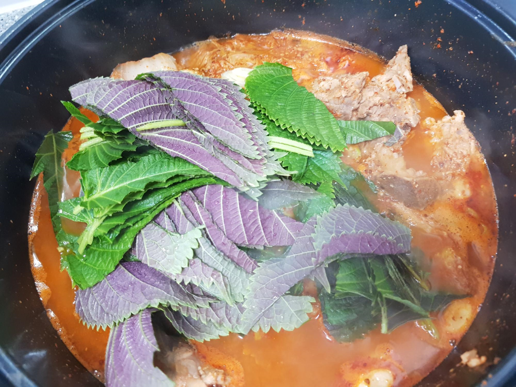 마지막으로 깻잎을 넣고 한소끔 더 끓여냅니다. 깻잎을 일찍 넣으면 형체를 알아보기 어려울 정도로 쪼그라들고 찢어져서 마지막에 넣어주는 게 좋아요.